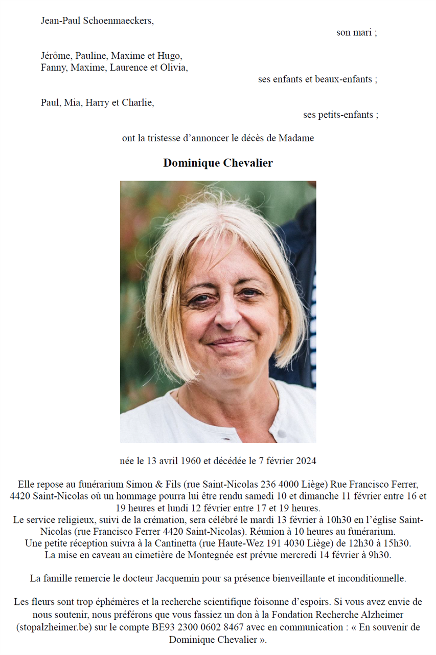 Décédée à Vottem (4041) le mercredi 7 février 2024 à l'âge de 63 ans