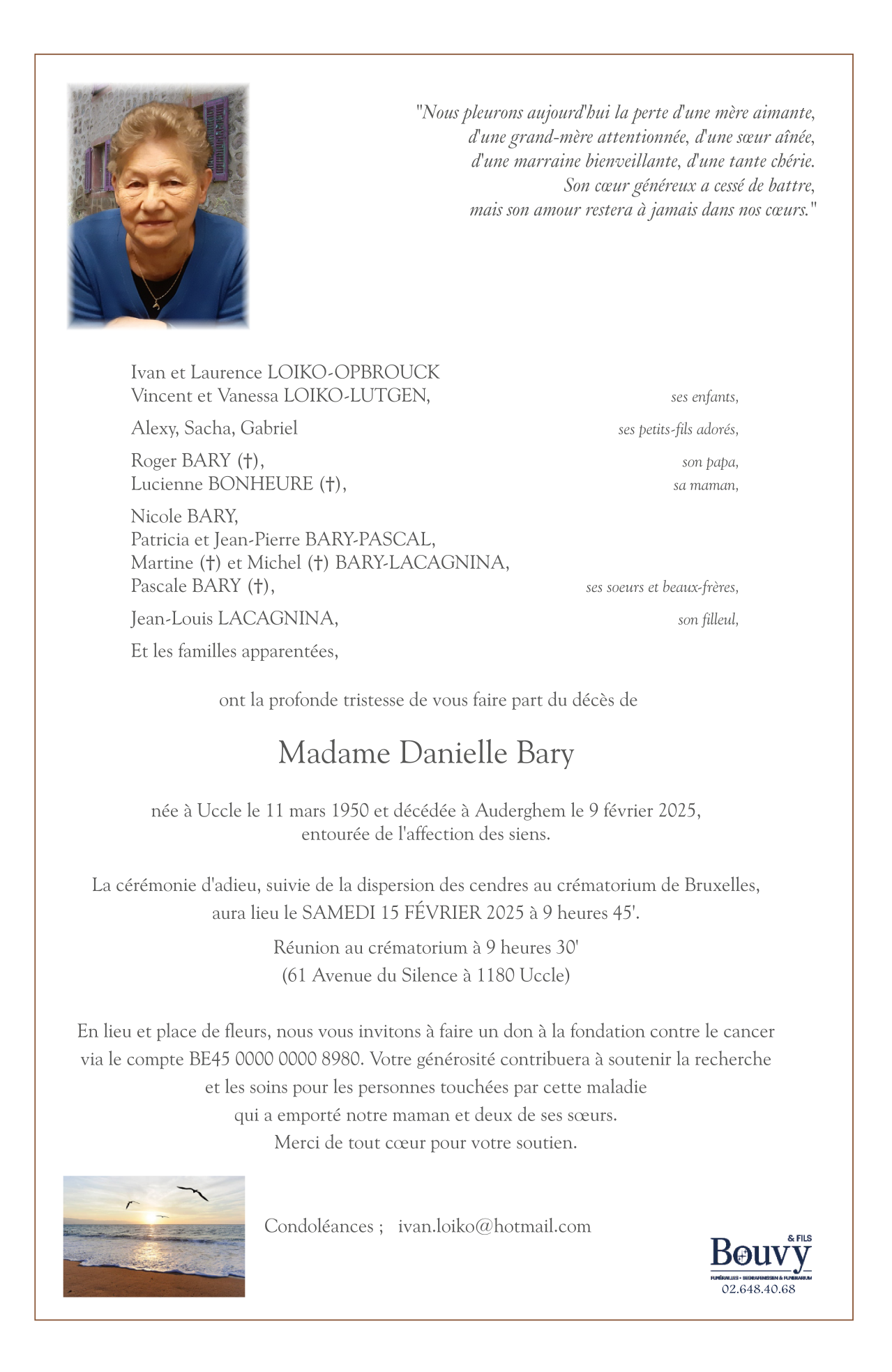 Décédée à Auderghem (1160) le dimanche 9 février 2025 à l'âge de 74 ans