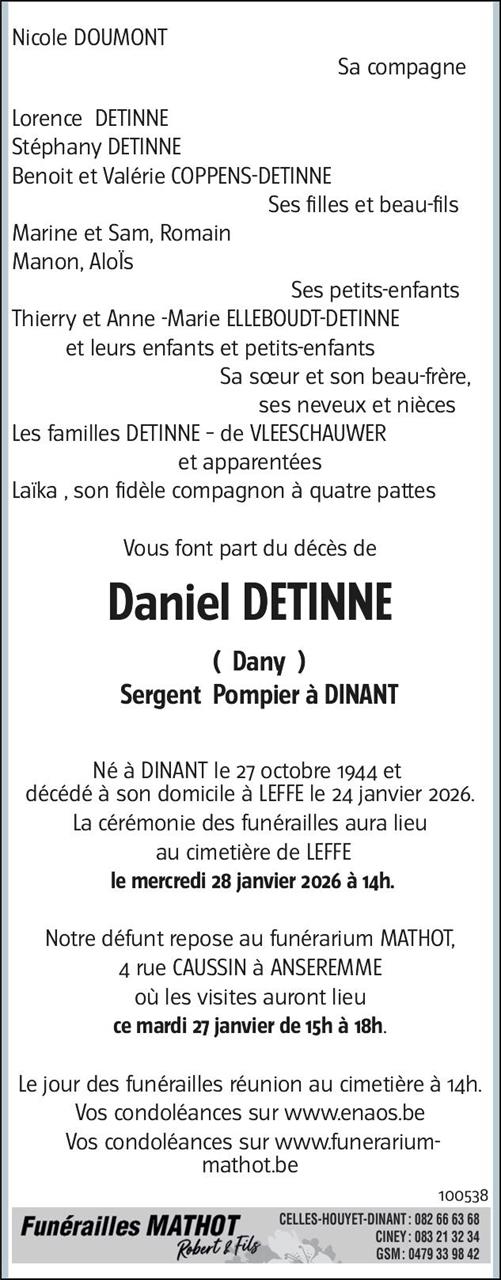 Décédé à Leffe (5500) le samedi 24 janvier 2026 à l'âge de 81 ans
